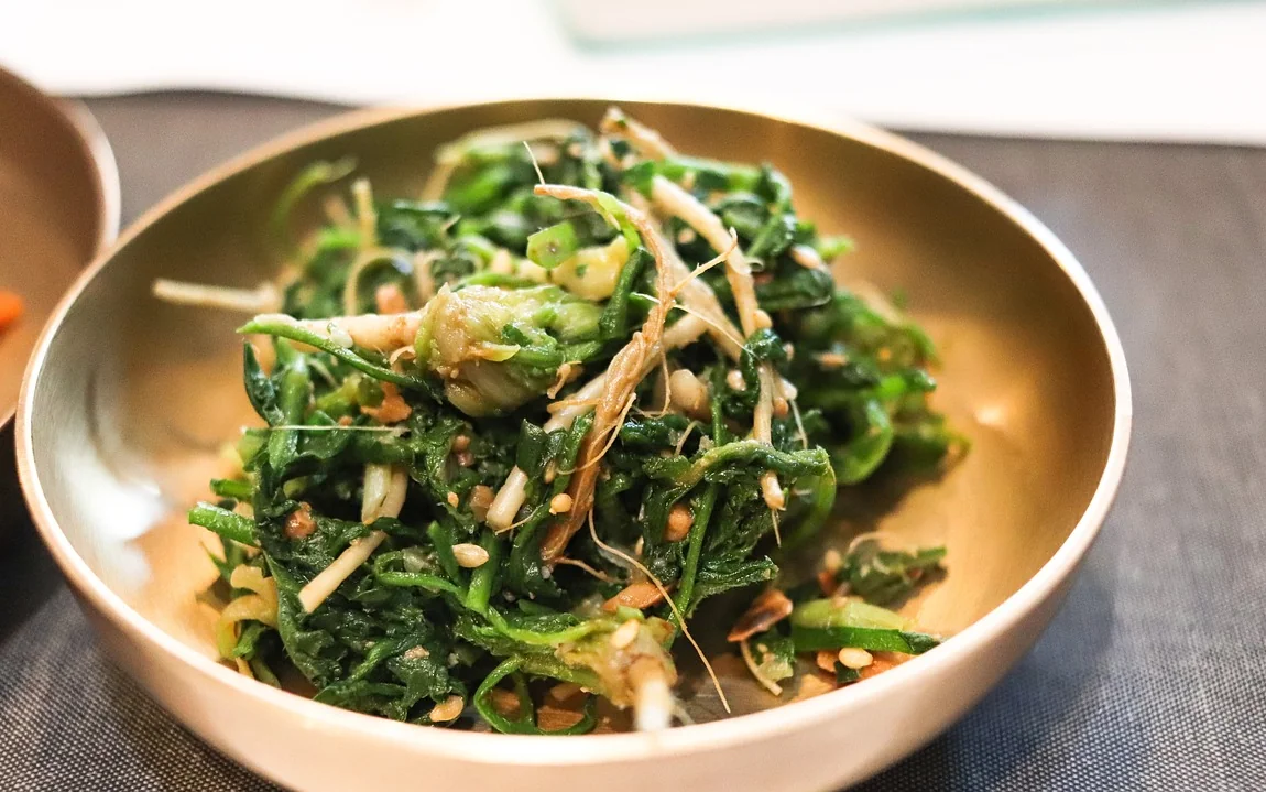 - 시금치나물: 데친 시금치를 소금, 다진 마늘, 참기름으로 무친 반찬